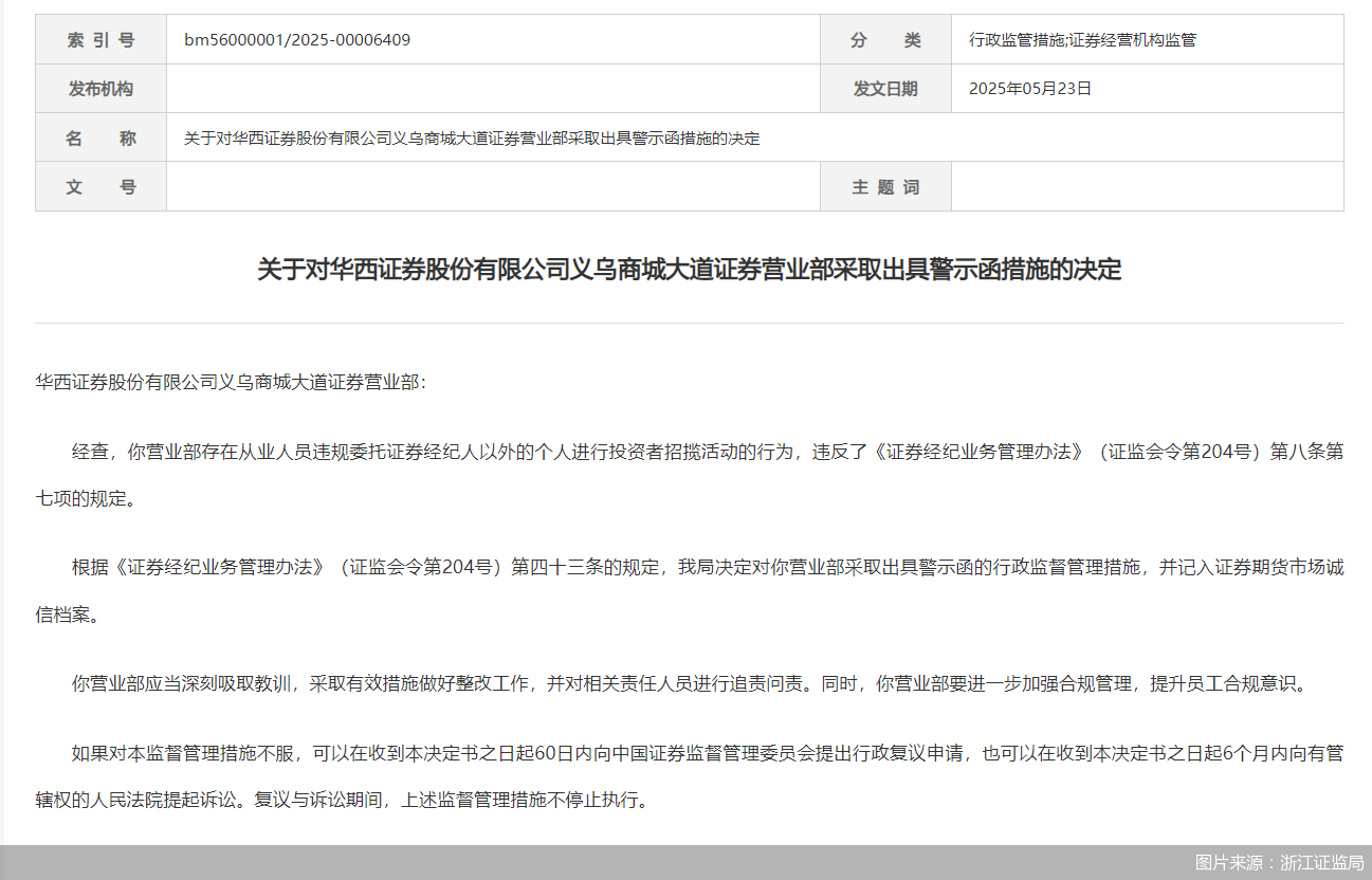 北京商报讯(记者 李海媛)5月23日,浙江证监局发文称,经查,发现华西证券股份有限公司义乌商城大道证券营业部(以下简称“义乌商城大道证券营业部”)存在从业人员违规委托证券经纪人以外的个人进行投资者招揽活动的行为,违反了相关规定。