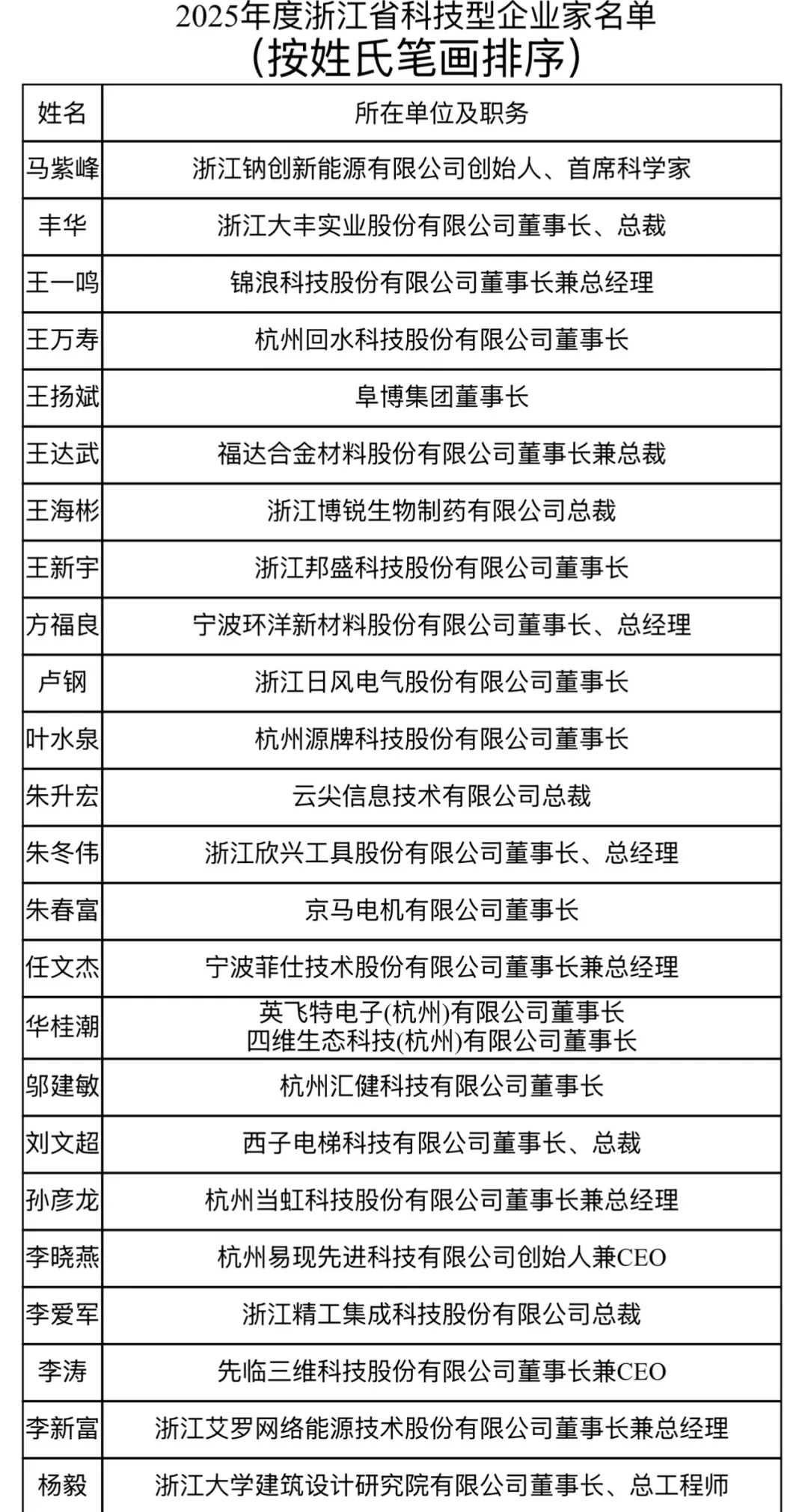 大丰实业董事长、总裁丰华,锦浪科技董事长、总经理王一鸣等宁波企业家入选2025浙江省科技型企业家;