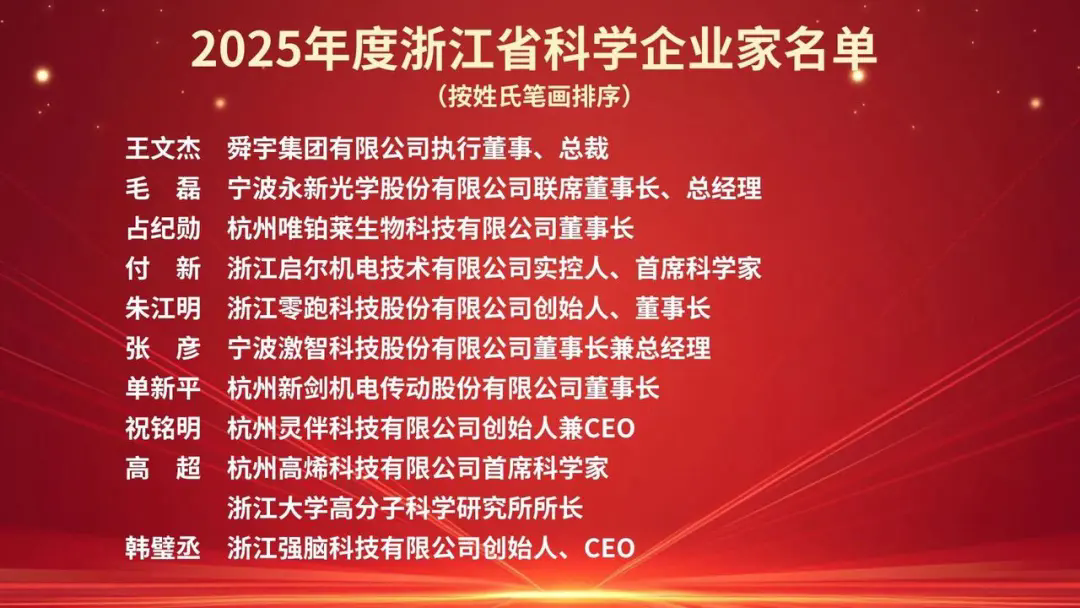 宁波军团中,舜宇集团执行董事、总裁王文杰,永新光学联席董事长、总经理毛磊,激智科技董事长兼总经理张彦入选2025年度浙江省科学企业家(共10人)。