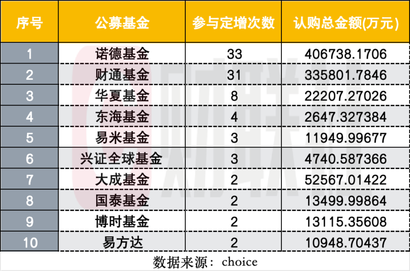 据Choice数据,截至目前,今年以来参与上市公司定增的公募共计22家,认购总额为97.08亿元;去年同期,参与定增的公募共18家,认购总额为145亿元。