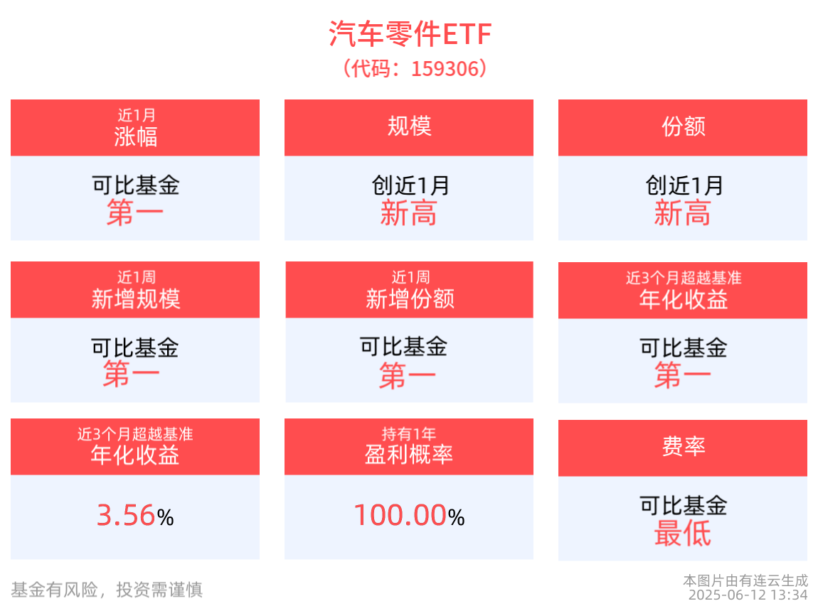 份额方面,汽车零件ETF最新份额达2324.46万份,创近1月新高。