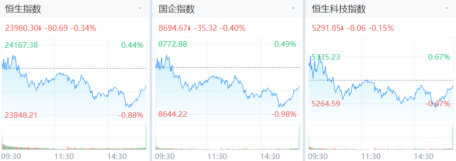 港股三大指数集体收跌,恒生指数跌0.34%再度失守24000点关口,国企指数、恒生科技指数分别下跌0.4%及0.15%,尽管地缘政治有缓和迹象,市场仍未能继续昨日上涨行情。