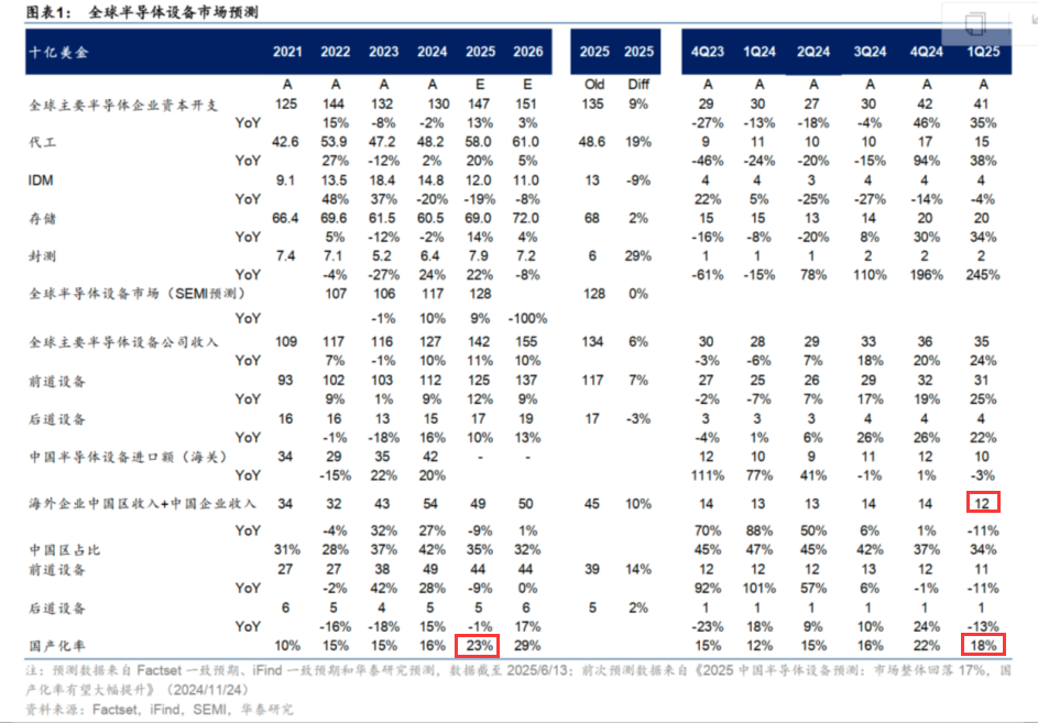 据华泰证券统计的10家国内半导体制造和22家国内及海外设备企业中国区收入数据,可以发现,1Q25中国及海外半导体设备企业中国区收入合计117亿美元,其中我国设备企业收入保持39%同比高速增长,国产化率达到18%,同比+6pct。往后看,据华泰预测及机构一致预期,国内主要设备公司收入2025年同比或增长30%,国产化率或同比+7pct至23%。