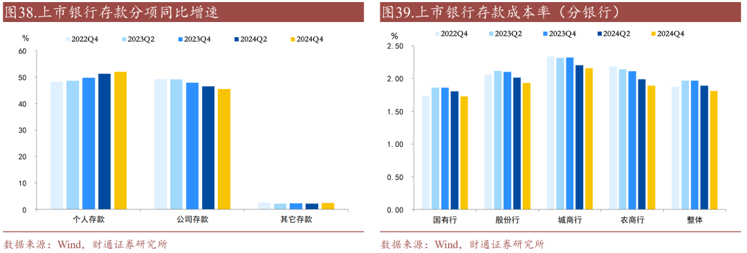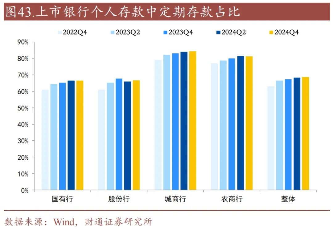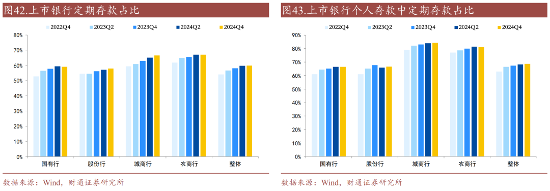 定期存款占比依旧保持高位,个人存款定期占比进一步上升。2024年下半年银行整体定期存款占比仅上升0.1个百分点,其中,国有行、股份行、城商行、农商行定期存款占比变化分别为-0.36、+0.92、+1.45、-0.05个百分点;对于个人存款,2024年下半年银行整体定期存款占比上升0.23个百分点,其中,国有行、股份行、城商行、农商行个人定期存款占比变化分别为+0.12、+0.81、+0.35、-0.13个百分点。