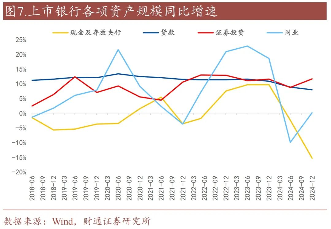 证券投资增速回升,贷款增速小幅下降。从同比增速来看,2024年年末,证券投资规模同比增速回升11.61%;贷款规模同比增速小幅下降至7.95%;现金及存放银行同比增速大幅下降至-15.44%;同业资产规模同比增速大幅回升至0.14%,表明打击手工补息的影响逐步减弱。