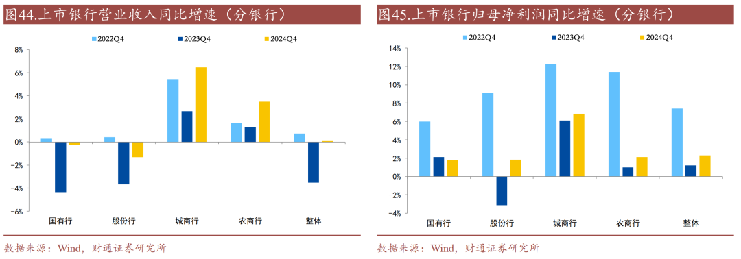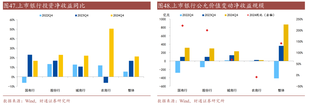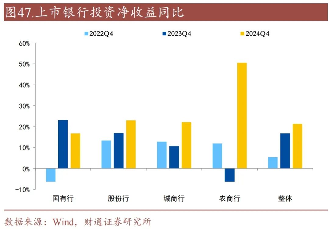 商业银行投资收益同比增速上升。2024年,上市银行的投资净收益同比增速上升4.5个百分点,至21.3%,分类别看,国有行、股份行、城商行、农商行投资净收益同比增速变化-6.3、+6.0、+11.4、+57.0个百分点,至16.8%、23.0%、22.2%、50.6%。