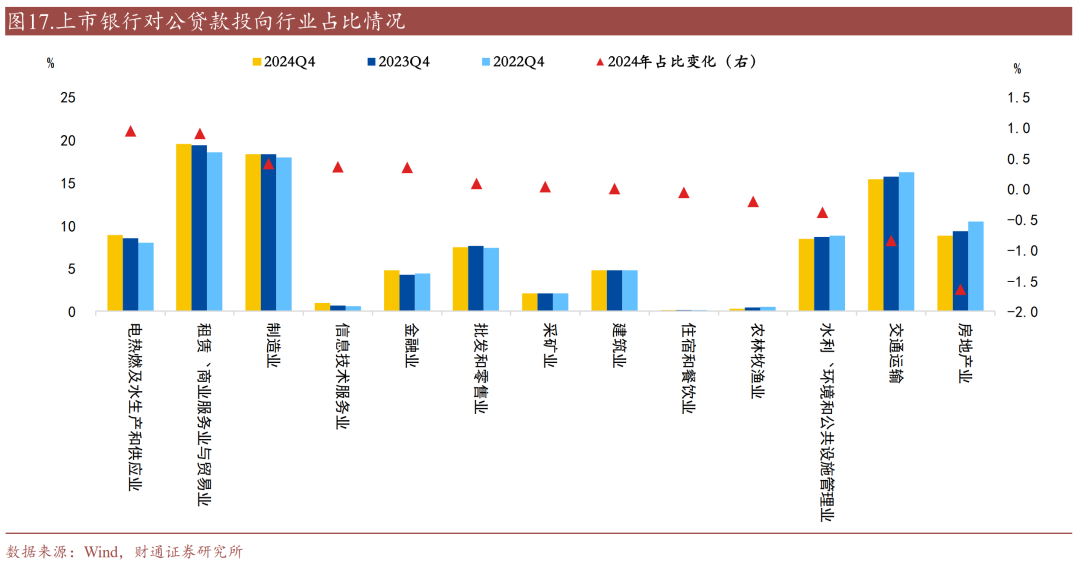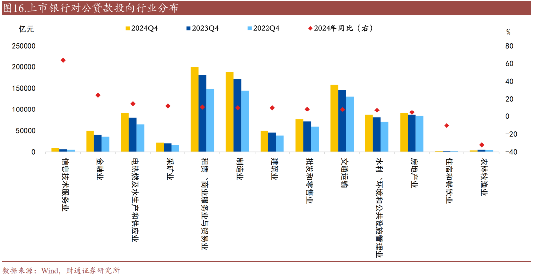 电热燃及水生产和供应业同比和占比均大幅提升,房地产占比大幅下降。从投向规模来看,租赁/商业服务与贸易、制造业、以及交运/仓储和邮政业始终维持贷款投向行业前三格局。同比来看,信息技术服务业、金融业、电热燃及水生产和供应业同比大幅增长,增速分别为63%、24%、15%。从占比来看,电热燃及水生产和供应业、租赁/商业服务业与贸易业、制造业占比提升最多,较2023年分别上升0.95、0.91、0.41个百分点;房地产、交通运输、水利环境和公共设施管理占比下降较多,较2023年分别下降1.64、0.84、0.38个百分点。