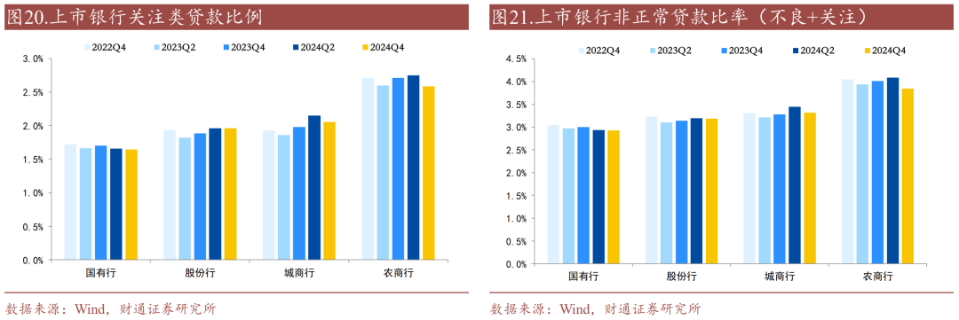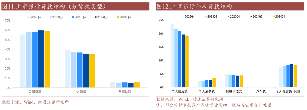 个人住房贷继续下滑,消费贷大幅增长。个人贷款方面,2024年下半年个人住房贷和个人经营贷+其他占比分别下降至19.23%、8.32%,绝对规模较2024年中分别下滑0.36%、1.59%,主要是居民提前还贷和地产销售低迷;2024年下半年信用卡透支和消费贷占比上升至4.40%、3.41%,绝对规模较2024年中分别上升3.34%、24.42%。