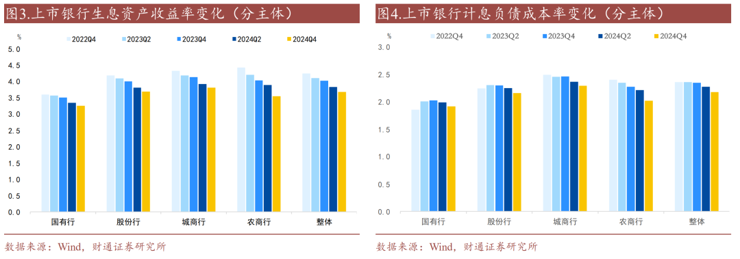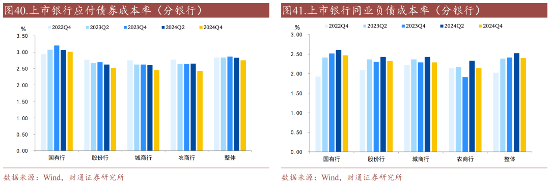 农商行同业负债成本率下降较多。2024年末国有行、股份行、城商行、农商行存款成本率分别下降0.08、0.08、0.05、0.11个百分点;债券发行成本分别下降0.06、0.10、0.15、0.20个百分点;同业负债成本分别下降0.14、0.11、0.13、0.19个百分点。