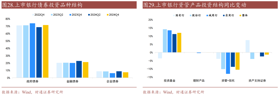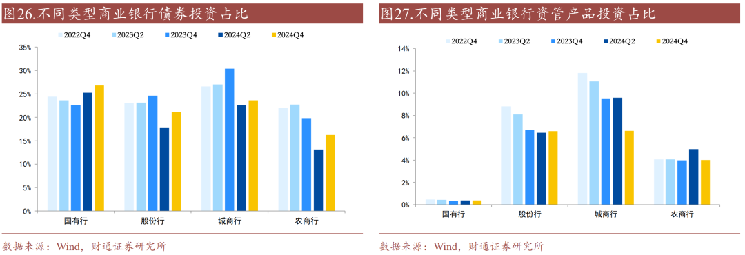 标准化债券投资占比大幅上升,资管产品投资占比下降。2024年末国有行、股份行、城商行、农商行对标准化债券的投资占比分别上升1.58、3.25、1.09、3.11个百分点;2024年末国有行、股份行、城商行、农商行对资管产品的投资占比变化分别为-0.01、+0.15、-2.97、-0.97个百分点。