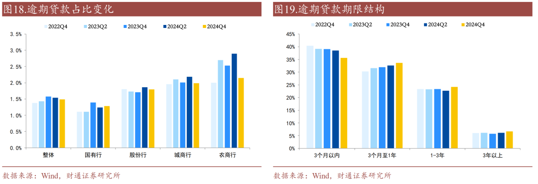逾期贷款期限有所上升。从逾期贷款期限结构来看,截至2024年末,3个月以上逾期贷款占比均有所上升,3个月至一年、1-3年、3年以上逾期贷款占比相较2024年中分别提高0.98个百分点、1.47个百分点、0.5个百分点;3个月以内逾期贷款占比均有所下降,相较2024年中下降2.95个百分点。