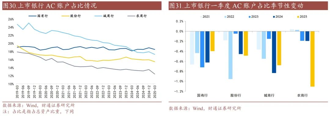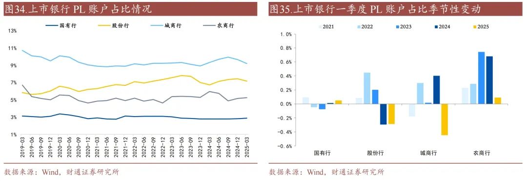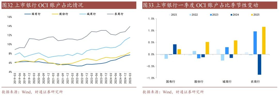 一季度AC账户占比大幅下降,OCI账户占比大幅上升。从占比来看,AC账户占比相对较高,但呈明显下降趋势,OCI账户占比次之,近年来呈上升趋势,PL账户占比较低,基本保持稳定。从季节性来看,2025年一季度国有行、股份行、城商行、农商行AC账户占比分别下滑0.4、0.5、0.7、1.1个百分点,农商行下行最为明显;OCI账户占比分别上升0.2、0.5、0.6、1.2个百分点;PL账户分别变动+0.1、-0.3、-0.4、+0.1个百分点。