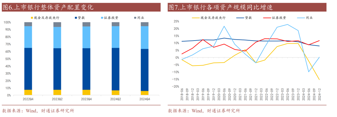 存款占比继续下降。2024年末银行负债结构中,吸收存款占比仍超过70%,但较2024年中下降0.5个百分点,央行借款规模占比下降0.5个百分点,应付债券和同业负债的规模占比分别增加0.5、0.4个百分点。