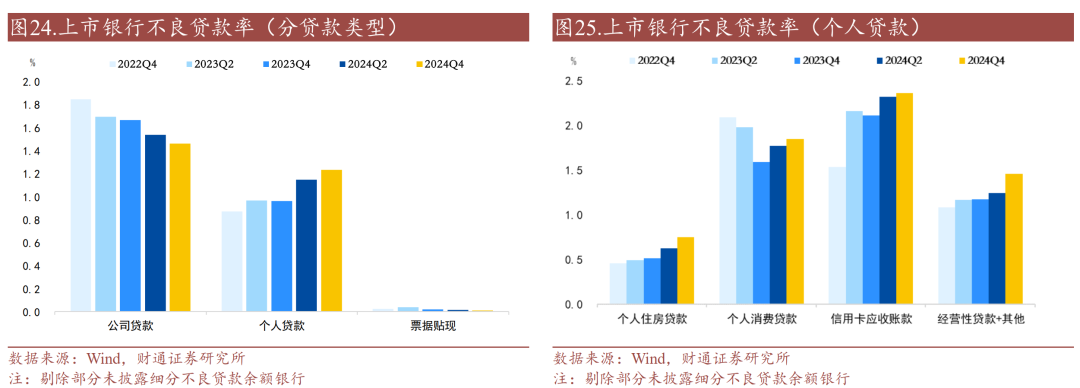 个人贷款不良率上升,经营性贷款+其他上升较多。从贷款类型来看,2024年末公司贷款不良率下降0.08个百分点至1.46%,个人贷款不良率上升0.14个百分点至1.29%,票据贴现不良率维持在0.01%;具体个人贷款中,个人住房贷款、个人消费贷款、信用卡应收账款、经营性贷款+其他不良率分别上升0.13、0.07、0.04、0.22个百分点,至0.75%、1.85%、2.36%、1.46%。
