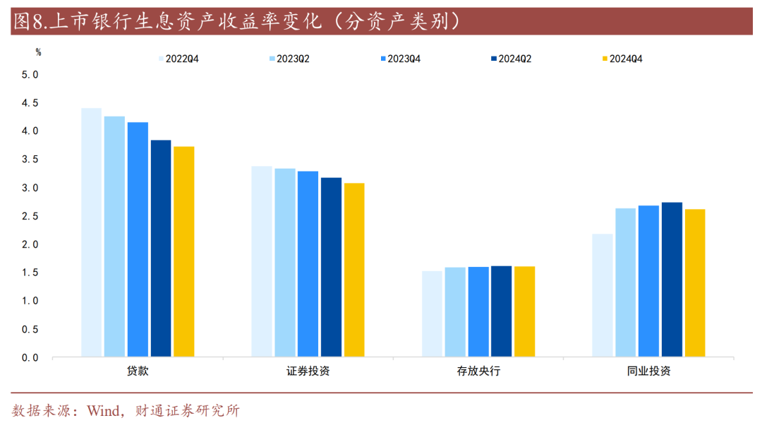 贷款、证券投资、同业投资收益率均有所下行,央行存放收益率基本持平。从收益率来看,2024年贷款、证券投资、同业投资收益率较年中分别下行0.12、0.10、0.13个百分点,同当前引导社会融资成本下行、利率处于下行周期的背景相吻合,带动生息资产收益率总体下行。此外,央行存放收益率基本持平。