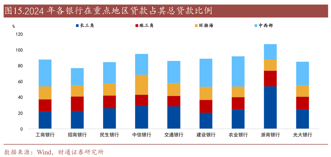 由于各银行业务所覆盖的区域各有偏重,且不同银行在区域的划分口径上有所差异,我们在上市的国股行(基本实现全国展业)中选择披露了长三角、珠三角、环渤海、中西部等重点地区的部分银行进行对比。