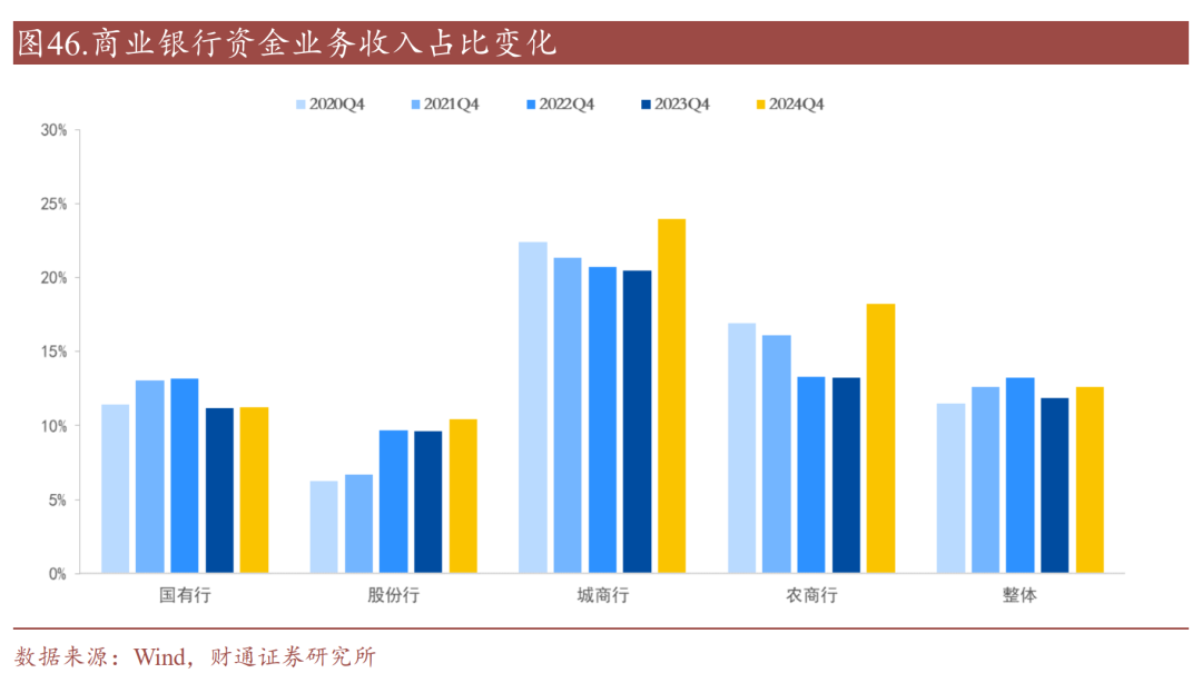 城农商行资金业务收入占比大幅提升。进一步观察资金业务,分类别看,城商行、农商行资金业务占比较2023年末上升较多;国有行公司金融、个人金融业务、资金业务占比上升;股份行公司金融业务占比下降较多,个人金融占比涨幅较大,资金业务占比小幅上升。