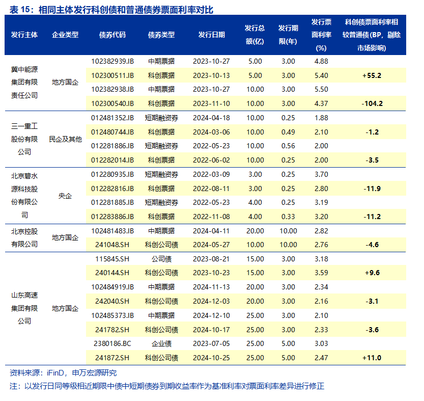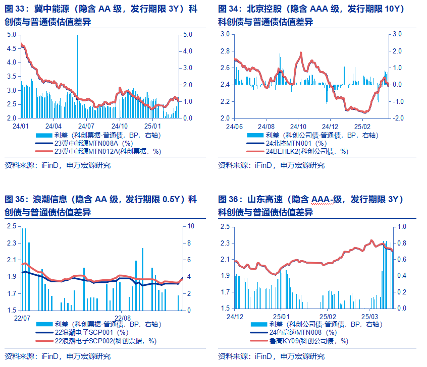 对同一主体而言,科创债与普通债估值走势基本一致,科创债或存在小幅溢价(可能就在2BP以内,但并不明显。选取冀中能源(隐含评级AA、3Y、煤炭行业)、北京控股(隐含评级AAA、10Y、公用事业)、浪潮信息(隐含评级AA、0.5Y、计算机)、山东高速(隐含评级AAA-、3Y、交通运输)四家主体发行的可比科创债和普通债的中债估值进行对比,发现二者估值走势基本一致,但科创债相较于普通债可能存在小幅溢价(大多科创债的中债到期收益率更高)。其中,北京控股、山东高速超额利差分别在-1.12BP~1.88BP、0~0.83BP区间,而资质稍弱的冀中能源、浪潮信息超额利差分别在0.02BP~17.25BP、0.12BP~18.78BP区间。市场对科创债的定价与其普通债券相近,但对低信用等级主体的科创债可能会要求更高的风险补偿。