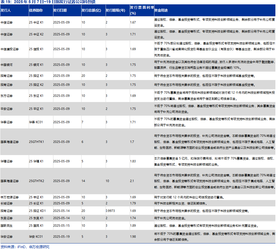 “科技板”出台首周债券发行表现如何?5月6日~5月19日,已有89家主体公告发行107只科创债,总规模突破2100亿元。其中,11家银行合计发行1150亿元、占比超五成,18家证券公司合计发行184亿元。从募资用途来看,银行科创债主要用于发放科技创新领域贷款,证券公司科创债通过股权、债券、基金投资等形式专项支持科技创新领域业务,而非金融科创债则以偿还债务为主,占比达52.1%。