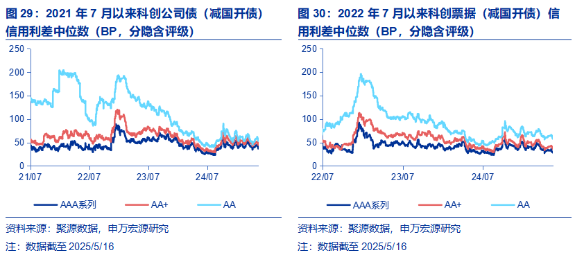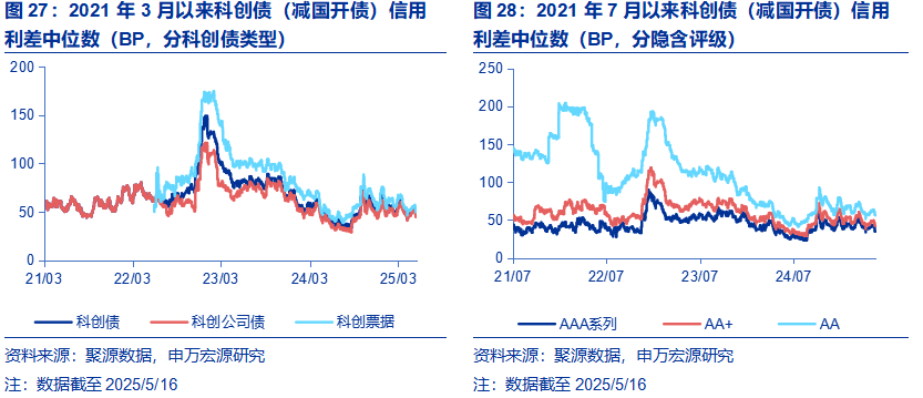 与信用债整体行情类似,当前科创债信用利差整体处于历史较低水平。从信用利差(减同期限国开债)来看,科创公司债与科创票据的信用利差走势相近,但由于科创票据整体主体资质较弱、信用风险更高,因此其信用利差整体略高于科创公司债。近年来,在资产荒持续演绎的背景下,科创债信用利差整体呈现压缩趋势,截至2025年5月16日,科创债整体信用利差已收窄至历史23.0%分位数水平(2021年3月1日有数据以来,下同),科创公司债、科创票据则分别位于26.3%、19.6%分位数水平。