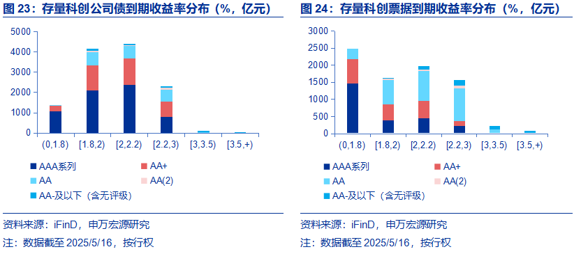 相较于科创票据,存量科创公司债整体到期收益率较高、待偿期限也相对更长。从收益率分布来看,存量科创公司债主要集中在[1.8%, 2%)、[2%, 2.2%)区间,分别占比34.0%、35.6%,存量科创票据分布相对分散,除上述两个区间外,(0%, 1.8%)、[2.2%, 3%)这两个收益率区间占比也较高,由低到高四个区间占比分别为31.2%、20.5%、24.7%、19.7%。从待偿期限分布来看,科创公司债存量债券待偿期限相对更长,主要集中于1-3年及3-5年,占比分别为43.7%、28.7%,科创票据则主要集中于1-3年及1年以内,占比分别为54.0%、30.6%。