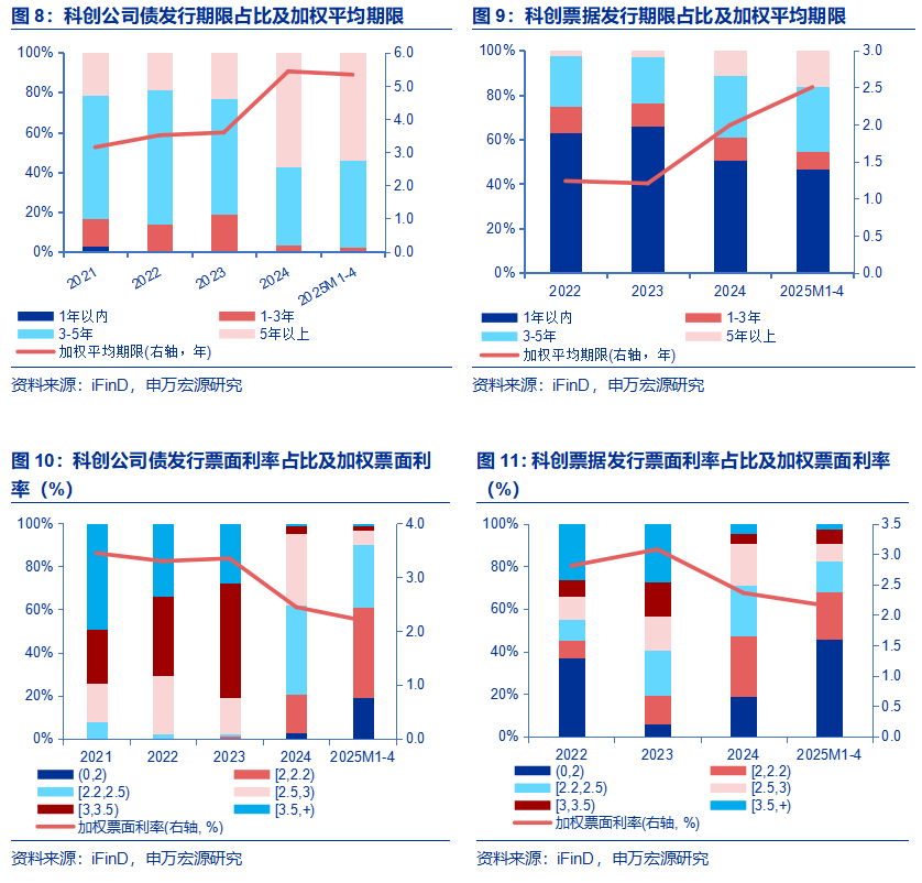 “科技板”从发行期限和债券类别方面做出更多指引。在2025年5月7日央行等三部委联合新闻发布会上,央行行长潘功胜明确表示支持股权投资机构发行8年期、10年期等更长期限的科技创新债券,进一步引导市场向中长期融资倾斜。2024年以来,5年期以内的中短期科创债占比已逐步下降,2023/2024/2025M1-4的占比分别为87.8%/65.8%/65.5%;细分长期科创债期限结构(大于5年期),10年期债券占比最高(2024/2025M1-4占比28.9%/26.4%),同时15年期和20年期超长期限科创债占比明显提升,2025年分别达到6%和3.6%,市场对超长期限债券的接受度逐步提高。此外,央行、证监会《关于支持发行科技创新债券有关事宜的公告》中提及“科技创新债券含公司债券、企业债券、非金融企业债务融资工具等”,现存科创债类型主要为(科创公司债)公司债券、(科创票据)中期票据、短融、ABN、PPN以及金融债,尚未有企业债券发行,将企业债券纳入科技创新债券范畴,产品体系更加丰富。