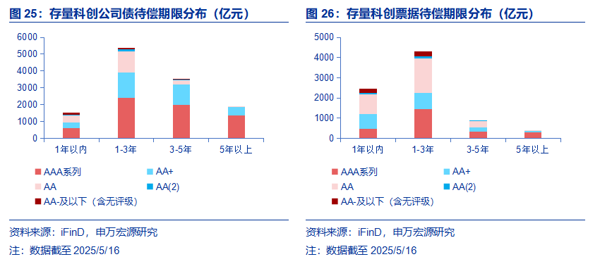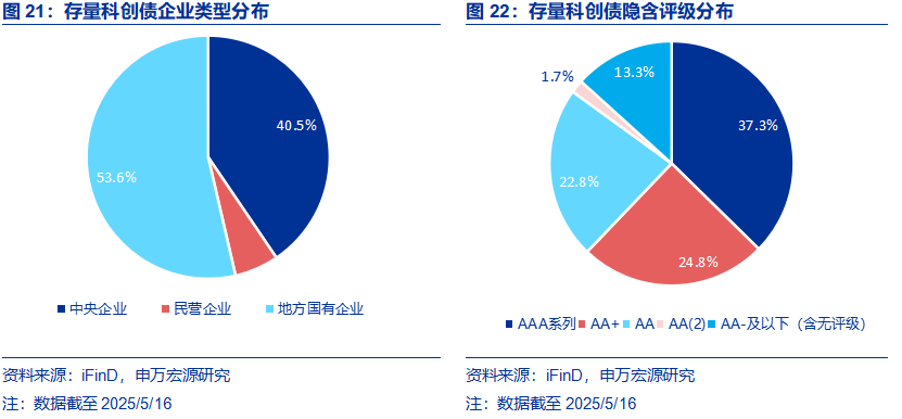 截至2025年5月16日,存续的科创债中,产业、城投、金融债规模占比分别为85.3%、9.3%、5.4%。从地区分布来看,山东、四川和湖北位列存量城投类科创债规模的前三大地区,北京、上海、广东位列存量产业类科创债规模的前三大地区,从行业分布来看,交运、综合和建筑装饰位居存量城投类科创债规模的前三位,建筑装饰、综合和公用事业位居存量产业类科创债规模的前三位。从企业类型来看,央企和地方国企仍是存量科创债主力军,分别占比40.5%和53.6%。从隐含评级来看,AAA系列、AA+、AA分别占比37.3%、24.8%、22.8%,合计85.0%,发行主体整体资质较高。
