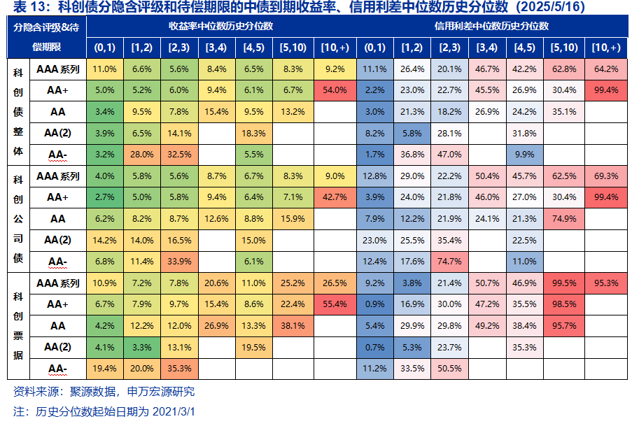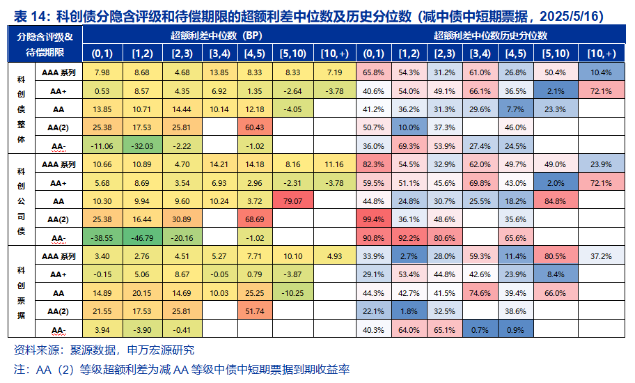 科创债的收益率和信用利差在内部表现分化。从收益率和信用利差来看,截至2025年5月16日,不同待偿期限、隐含评级的科创债收益率中位数在1.7%-3.4%区间,信用利差在25-180BP之间。AAA系列信用利差较低,位于25-60BP,且拉长期限并未带来明显溢价;而AA及以下等级债券的期限利差则明显增厚,尤其是AA-等级,待偿期限[4,5)相较于(0,1)、[1,2)、[2,3)分别有100.8BP、106.2BP、53.8BP的期限利差。此外,低等级(AA和AA-)科创票据的信用利差高于科创公司债,而中高等级(AAA系列和AA+)科创票据的信用利差低于科创公司债。从历史分位数来看,0-3Y短久期各等级(除AA-外)科创债信用利差处于历史较低分位数(均低于40%),而5Y及以上高等级科创债历史分位数较高。