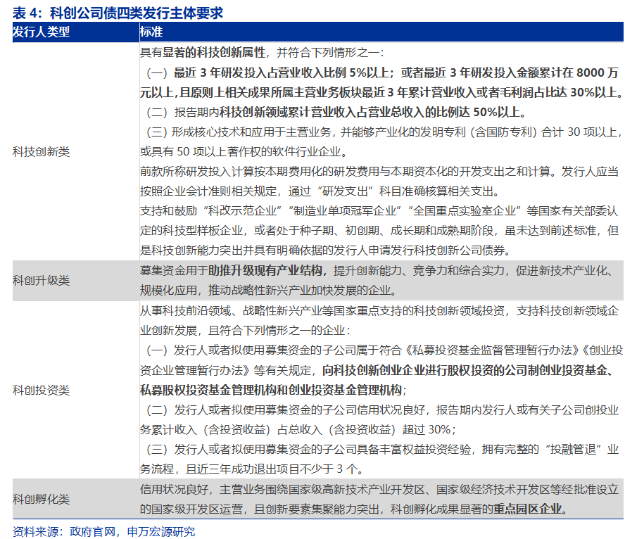 发行主体:发行人申请发行科技创新公司债券并在交易所所上市或者挂牌的,应当公司治理规范,诚信档案无不良记录,最近一期末资产负债率原则上不高于80%,支持科创企业类、科创升级类、科创投资类和科创孵化类四类发行人,涵盖了从孵化类“播种”、到中小科创类以及亟需产业升级的大型成熟企业。