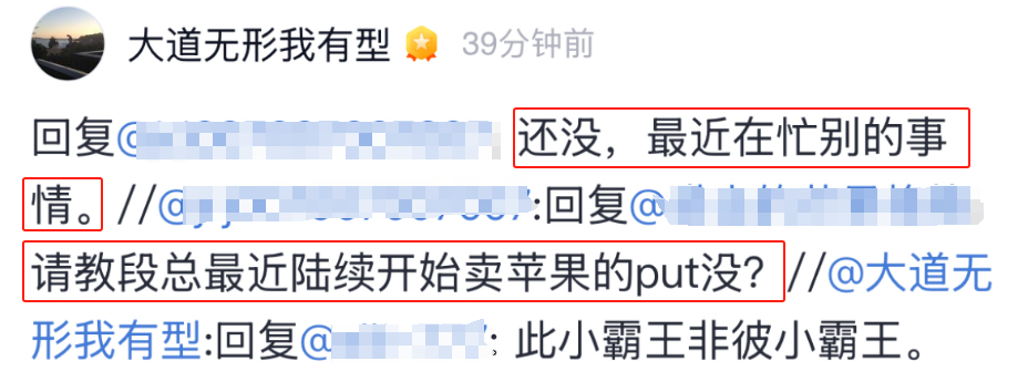 近期苹果股价相对低迷,在社交媒体上也有网友问段永平:“请教段总最近陆续开始卖苹果的put没?”