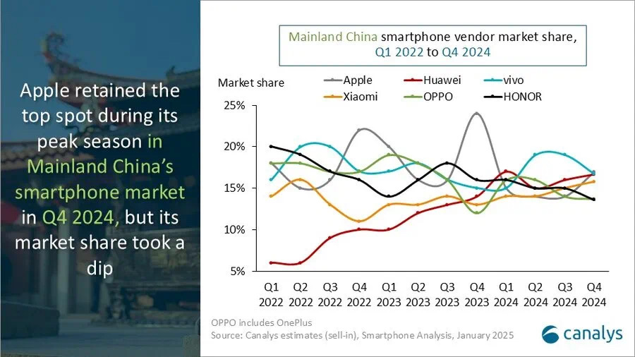 消息面上,多篇媒体文章报道苹果iPhone在中国销售疲软。Canalys数据显示,2024年第四季度,苹果iPhone在中国大陆市场出货量下滑高达25%,共出货1310万部,市场份额17%。