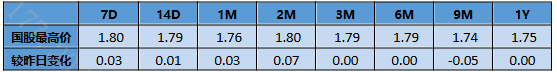 今日二级存单交投情绪尚可。资金偏松,早盘成交与昨日收盘基本持平。午盘后受经济数据与市场持券过节情绪影响,长期限存单有所下行。分期看国股存单,6月到期1.72;9月底到期1.74;12月底到期1.75;次年4月到期1.7525。