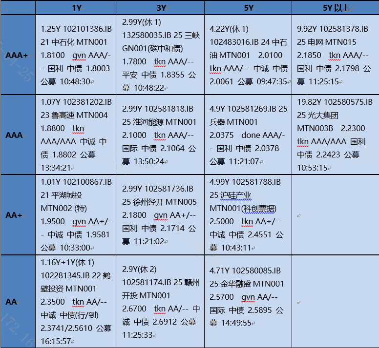 银行间短债市场交投整体维持清淡状态,今日情绪小幅好转。AAA2季度在1.74-1.80,3季度在1.75-1.85,4季度在1.78-1.87,25Q1在1.8-1.88。