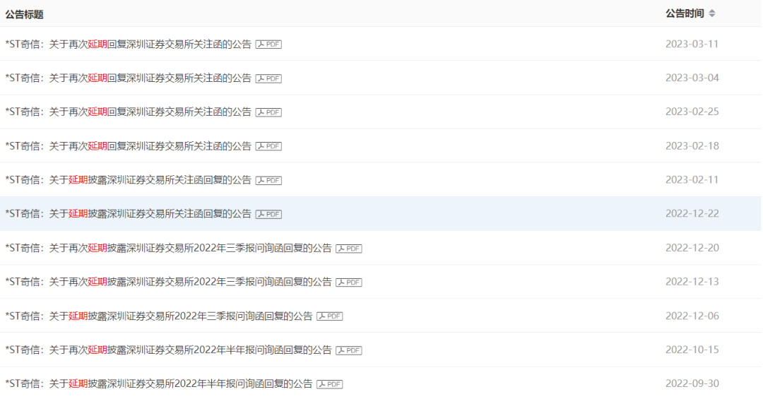 自去年7月以来,在面对监管层面的回复方面,*ST奇信承受着巨大压力。仅在监管函件方面,*ST奇信收到5份监管函件,关注事项涉及2022年半年报、2022年三季报等。而且*ST奇信在此期间申请延期回复11次,原因为“相关事项尚需作进一步补充、核实和完善”。