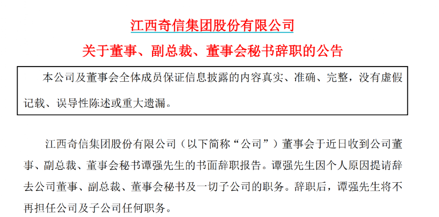 4月22日,*ST奇信连发三份公告,该公司财务总监马计,董秘谭强,证代余丽丽,近日均以个人原因为由辞职。辞职后,三人不再担任公司及子公司任何职务。而由于董秘职务空缺,*ST奇信暂定由董事长张浪平代理董秘职务。