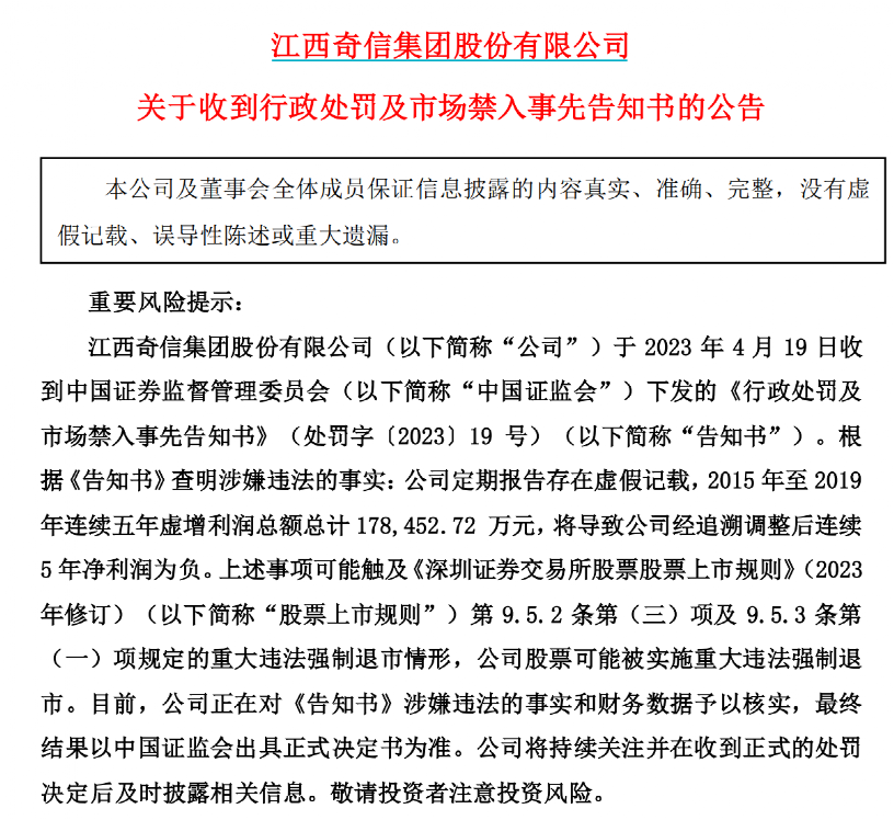 *ST奇信在公告中称,目前公司正在对《行政处罚及市场禁入事先告知书》涉嫌违法的事实和财务数据予以核实,最终结果以中国证监会出具正式决定书为准。