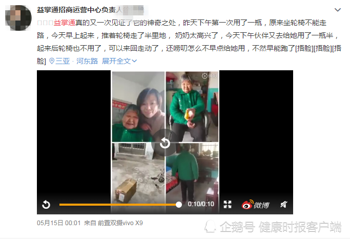 “奶奶原来坐轮椅不能走路,昨天用了一瓶益掌通,今天早上站起来了。”“河南一位大叔,三年前脑中风导致手脚麻木,用了七天益掌通手不麻了。