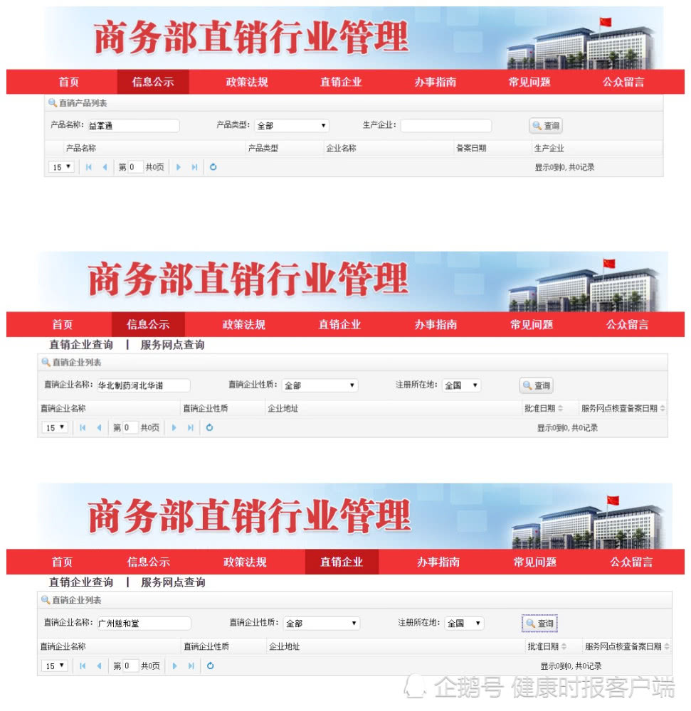 虽然宣称产品的营销模式为直销,但是记者查看商务部直销行业管理网站发现,河北华诺有限公司、广州慈和堂有限公司并不在商务部直销企业目录中,益掌通也不在直销产品目录中。
