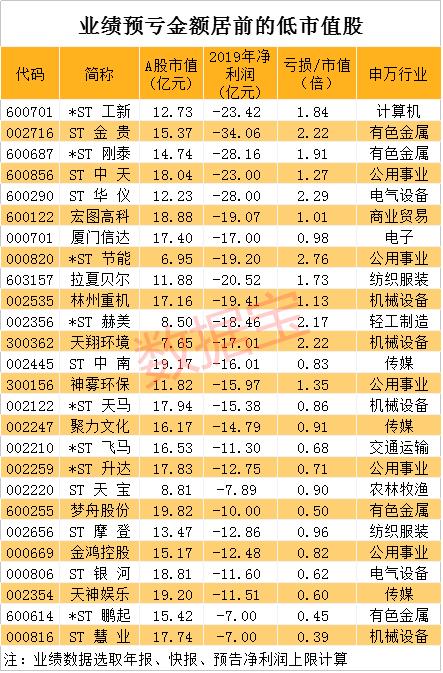 不少低市值股业绩堪忧。从已公布的年报、快报、预告净利润下限数据来看,26股去年预亏金额在10亿元以上。预亏金额最高的是*ST工新,公司预计去年亏损23.42亿元至34.65亿元,一年的亏损额甚至超过了其十几亿的A股市值。