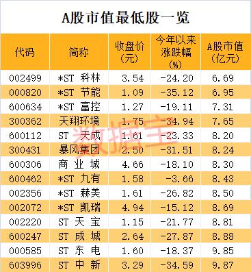 今年在疫情的冲击下,大批上市公司股价遭受重创,市值也大幅缩水,这其中不少是昔日市场爆炒的题材股。证券时报·数据宝统计显示,不含暂停上市股,截至目前A股市值不足20亿元的股票攀升至375只,其中有6股于昨日创下历史新低,分别是*ST工新、ST金贵、拉夏贝尔、林州重机、神雾环保。市值最低的是*ST科林,其最新A股市值6.69亿元。就在月初,该股创下历史低点3.4元,最新股价3.54元。