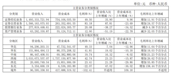 其中,证券经纪业务营业收入14.93亿元,较上年增长35.90%,毛利率49.50%,同比增加11.91个百分点。证券自营业务营业收入15.66亿元,较上年增长87.81%,毛利率83.18%,同比增加24.57个百分点。投资银行业务营业收入2.78亿元,较上年下降38.27%,毛利率20.08%,同比减少4.58个百分点。资产管理业务营业收入6329.23万元,较上年下降51.19%,毛利率12.90%,同比减少32.05个百分点。