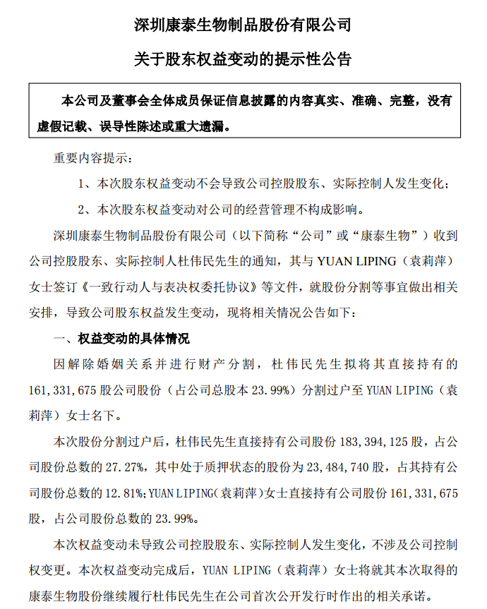 康泰生物(300601.SZ)公告,因解除婚姻关系并进行财产分割,公司控股股东、实控人杜伟民拟将1.61亿股公司股份(占公司总股本23.99%)分割过户至YUAN LIPING(袁莉萍)女士名下。YUAN LIPING(袁莉萍)承诺不谋求公司实际控制权,同意将所持股份的表决权等股东权利委托予杜伟民,并与杜伟民建立一致行动关系。