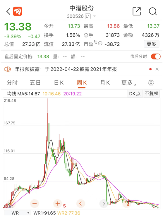 2022年3月14日,中潜股份报收13.38元/股,下跌3.39%,而过去一年该股已下跌83.13%。中潜股份为何暴跌超八成?