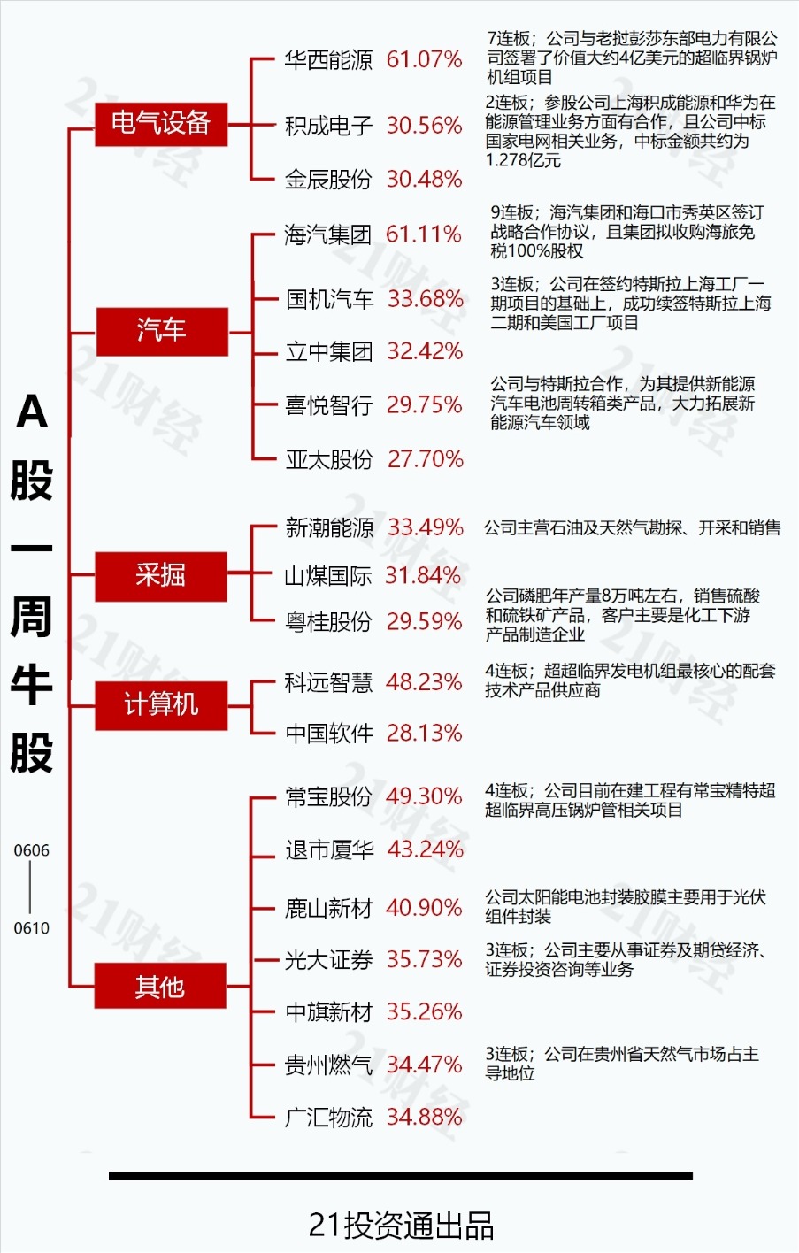 剔除最近1个月上市的次新股,海汽集团(603069.SH)以61.11%的周涨幅领涨本期牛股榜,华西能源(002630.SZ)、常宝股份(002478.SZ)、科远智慧(002380.SZ)等周涨幅紧随其后,牛股榜前16股涨逾30%。