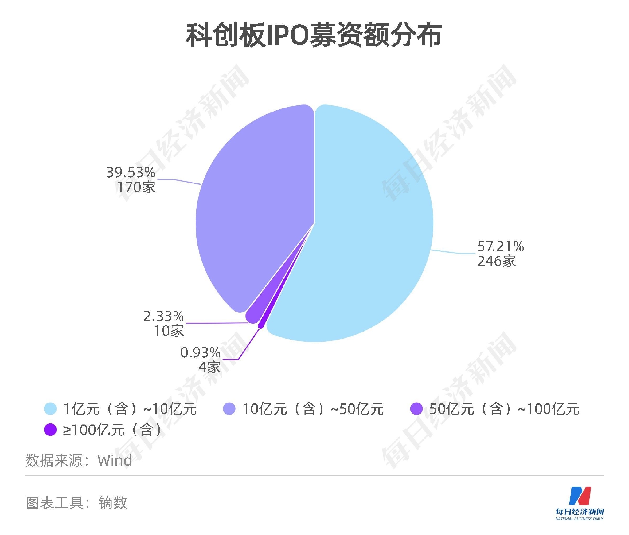 虽然从平均募资数据看,好像每家募资都很“充足”,但进一步分析不难发现,科创板公司IPO募资额两极分化较为明显:虽然430家科创板公司IPO募资额均超过了1亿元,但近六成公司IPO募资额未超过10亿元;IPO募资额超过50亿元(含)但不足100亿元的,只有10家,占比2.33%;募资额超过100亿元(含)的仅有4家,占比0.93%。