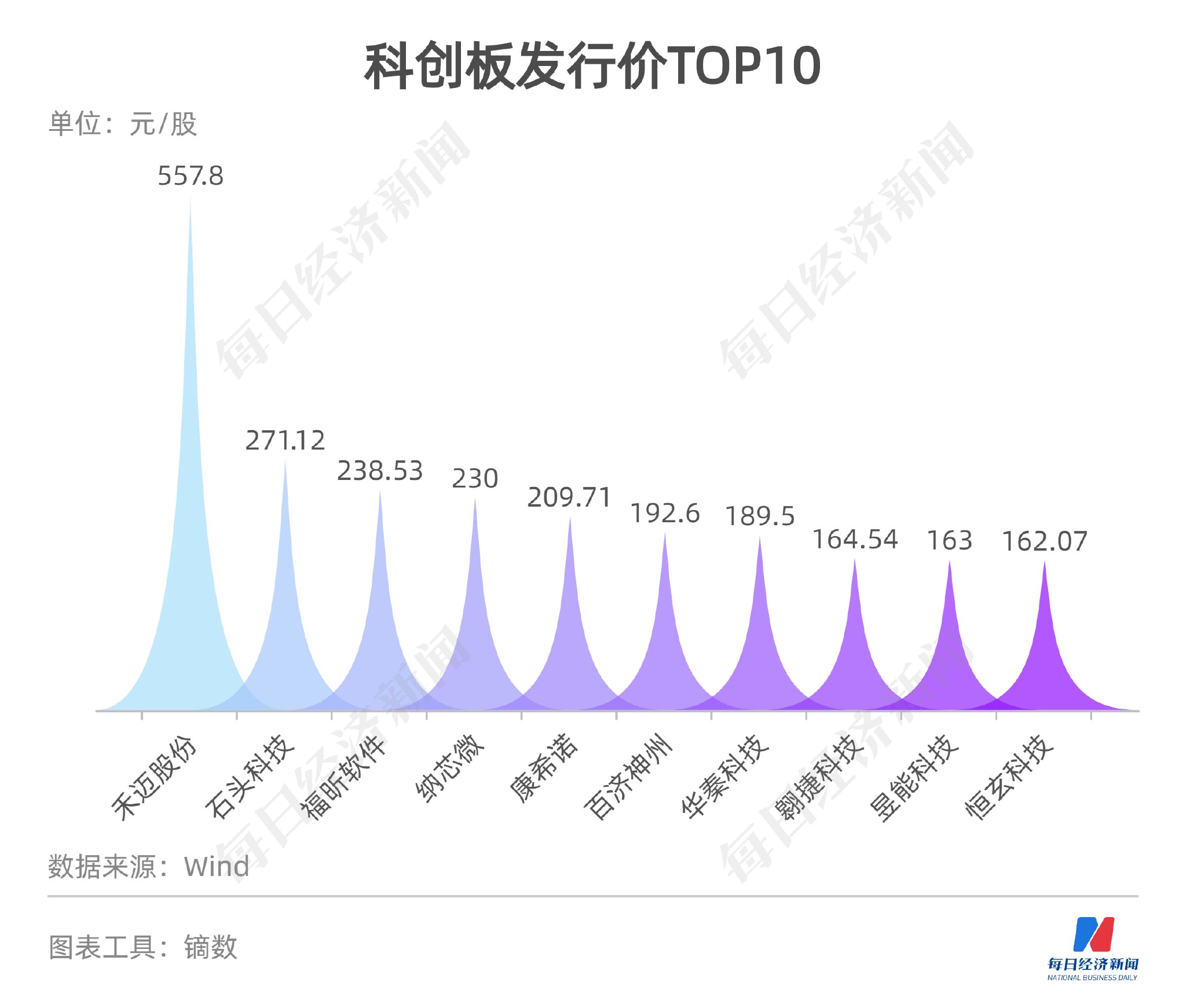 《每日经济新闻》记者注意到,430家科创板公司中,发行价超过百元的有26家,但募资前十名中,发行价超过百元的仅有3家,而科创板IPO发行价排名前三的3家公司——禾迈股份(SH688032,股价936.99元,市值525亿元)、石头科技(SH688169,股价346元,市值324亿元)、福昕软件(SH688095,股价68.99元,市值46亿元)均不在募资前十名榜单中。