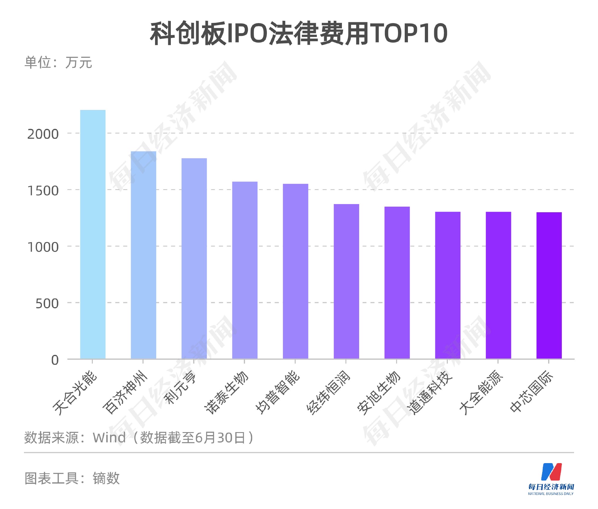 430家科创板上市公司IPO时的法律费用合计为21.89亿元。单从法律费用来看,单家公司少则不足百万。比如,同益中(SH688722,股价16.08元,市值36亿元),仅为94.34万元,也是430家科创板上市公司中唯一一家IPO法律费用小于100万元的公司;多则上千万,如天合光能(SH688599,股价69.96元,市值1516亿元)IPO法律费用为2200万元,也是唯一一家超过2000万元的公司。