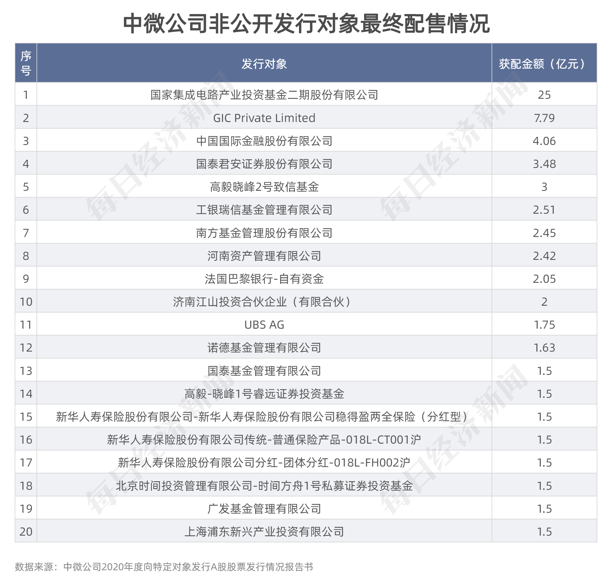 具体来看,中微公司定增股的认购方中,国家集成电路产业投资基金二期股份有限公司认购数量为2444.03万股;GIC Private Limited(新加坡政府投资有限公司)、瑞士银行、法国巴黎银行认购数量分别为761.56万股、232.67万股和263.96万股。此外,中金公司、国泰君安、高毅资管等也参与认购。
