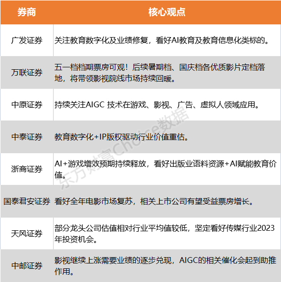 就此,寻找当前市场风口,广发证券表示,关注教育数字化及业绩修复,看好AI教育及教育信息化类标的;天风证券指出,部分龙头公司估值相对行业平均值较低,坚定看好传媒行业2023年投资机会;中泰证券认为,教育数字化+IP版权驱动行业价值重估。