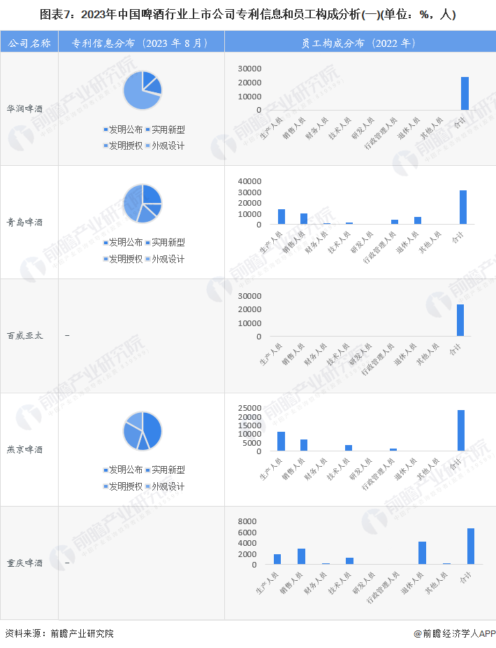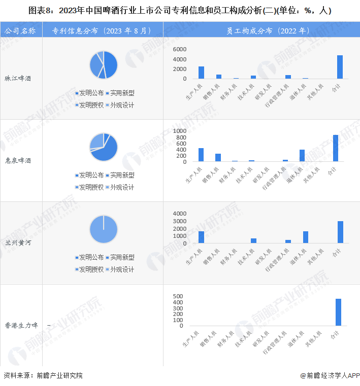 从啤酒行业的上市企业专利分布及人员情况来看,行业上市公司申请专利类别主要为发明公布和外观申请;员工总数最多的是青岛啤酒,2022年企业员工总数为31707人;生产人员最多的同样是青岛啤酒。2022年销售人员总数为21149人(不含华润啤酒和百威亚太);销售人员占比最高的是重庆啤酒,2022年销售人员数占总人数的44%左右。